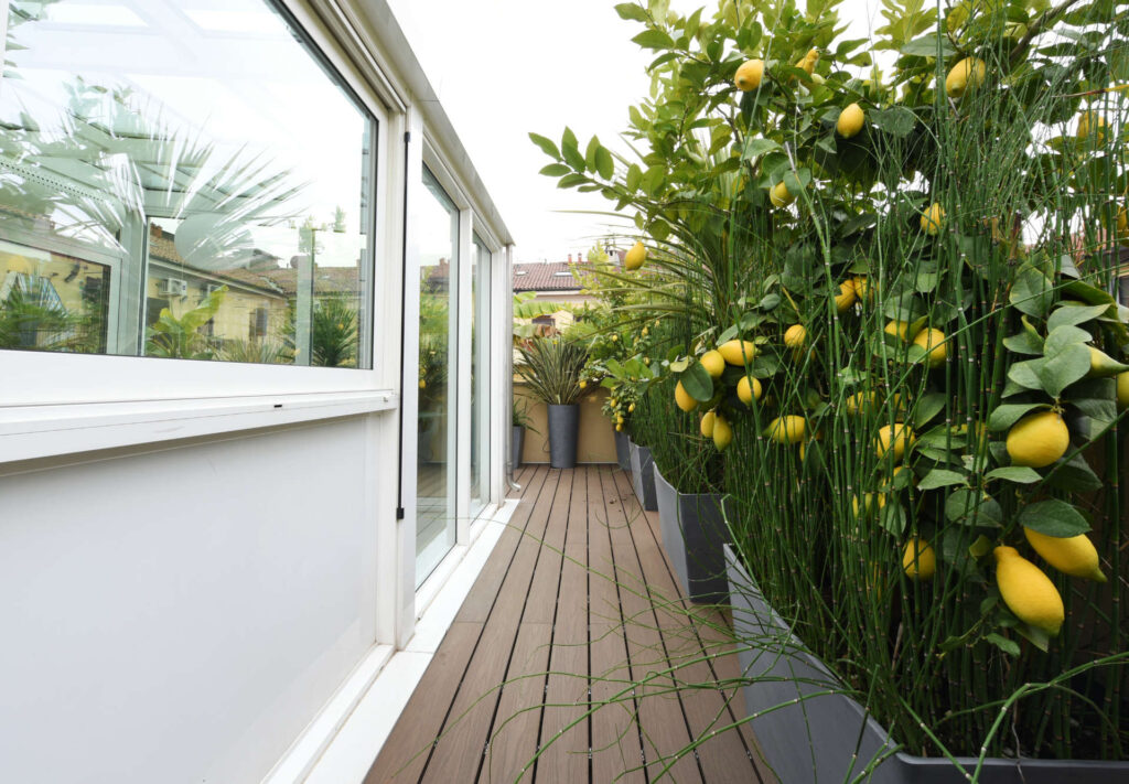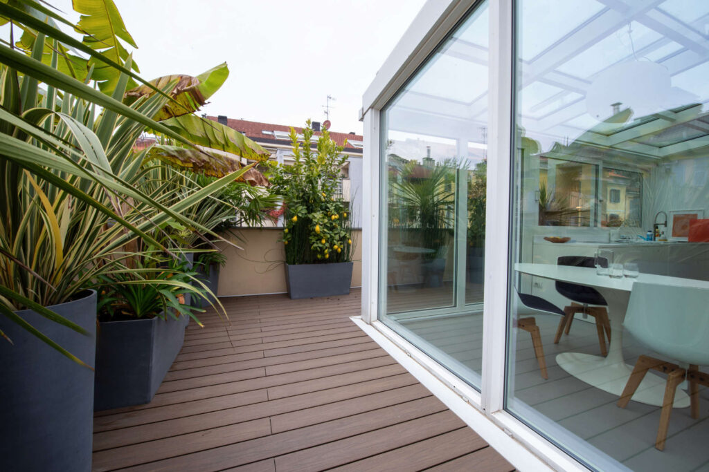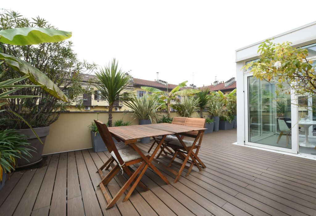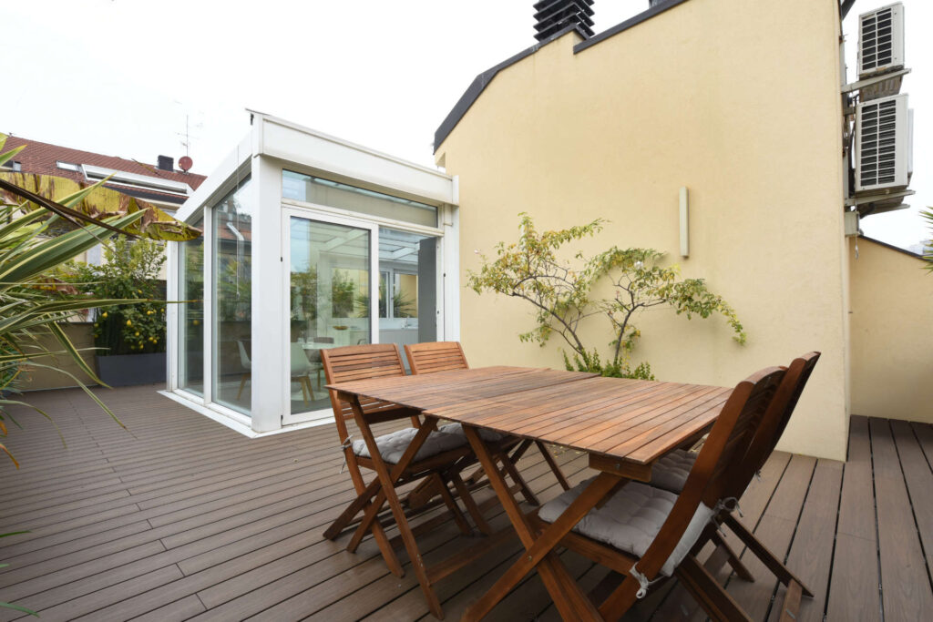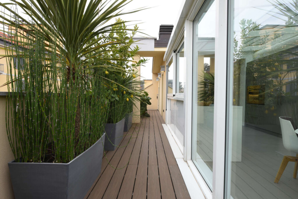 Rifacimento delle impermeabilizzazioni e della pavimentazione in doghe del terrazzo esterno.